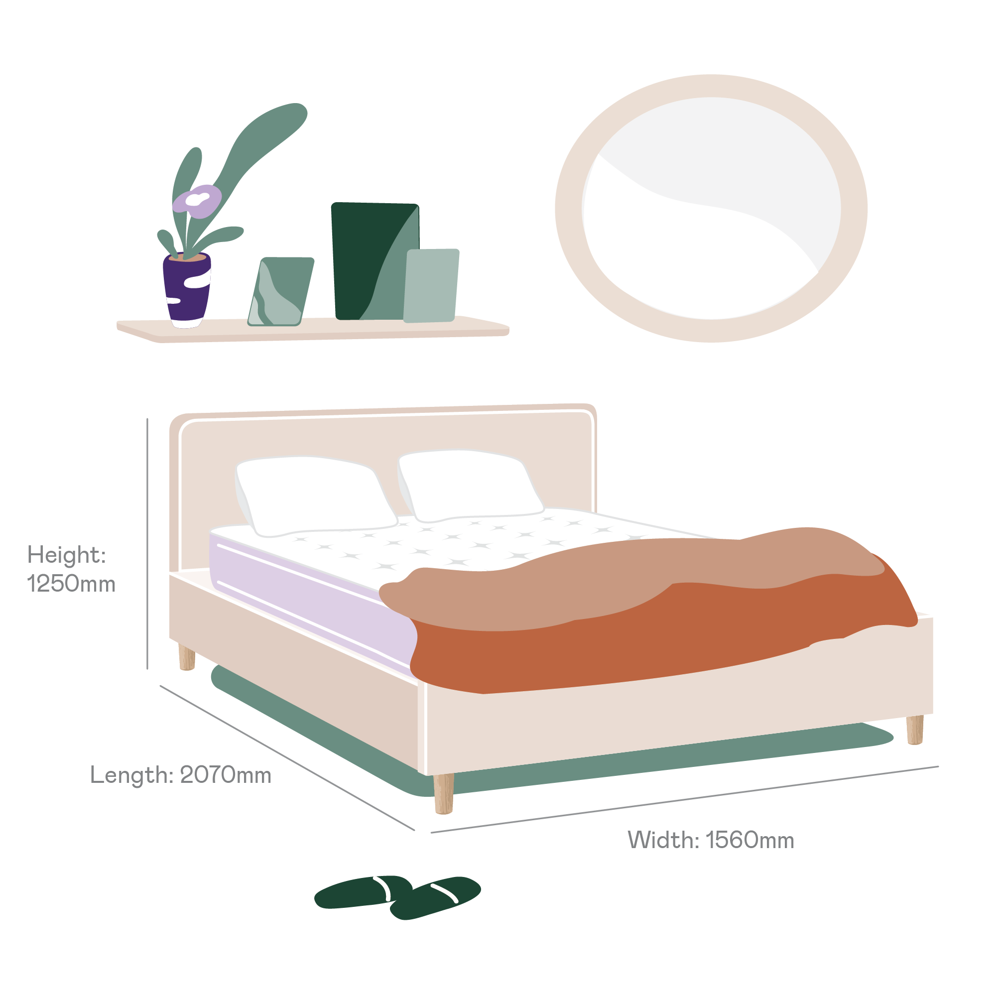 Generally, a queen bed frame size is around 2.1 to 2.5 m long and 1.6 to to 1.9 m wide (including the width of the bedhead). The dimensions of a queen bed frame can vary slightly, depending on the design of the bed frame itself. However, they are made to accommodate a standard queen size mattress.