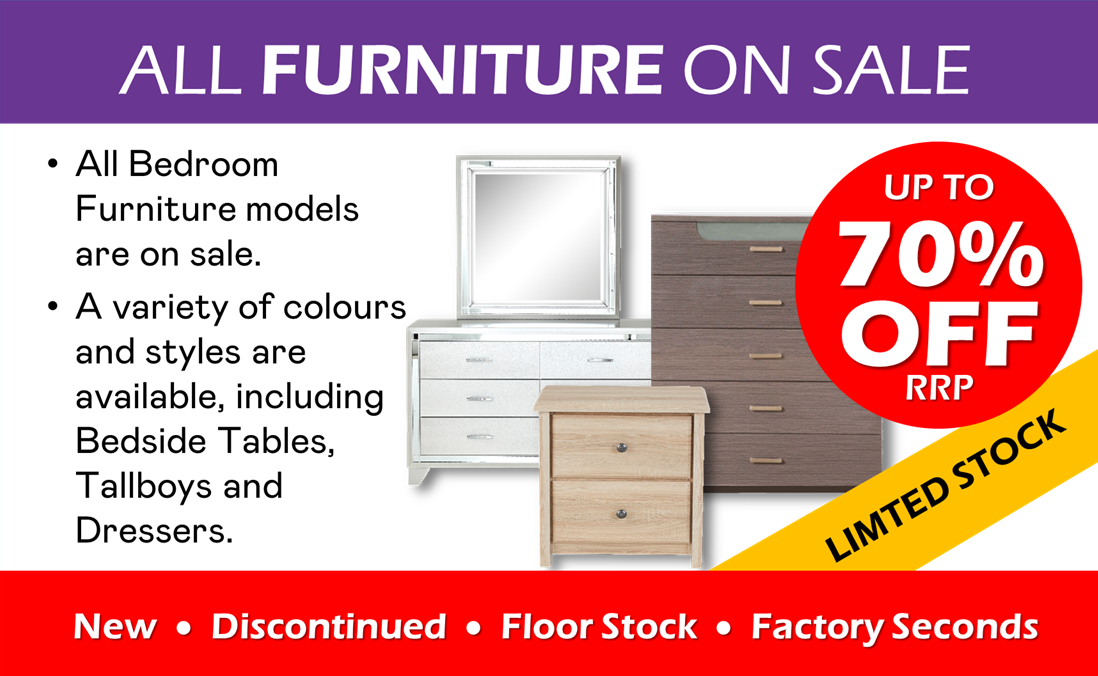 Displayed products include a mix of new, discontinued, floor stock and factory seconds. Product availability alters frequently and delivery of some models can not be guaranteed at the time of inspection. Products shown are for illustrative purposes only. Available stock will vary, while stock lasts. Delivery and assembly are additional charges. Standard product Warranties apply.