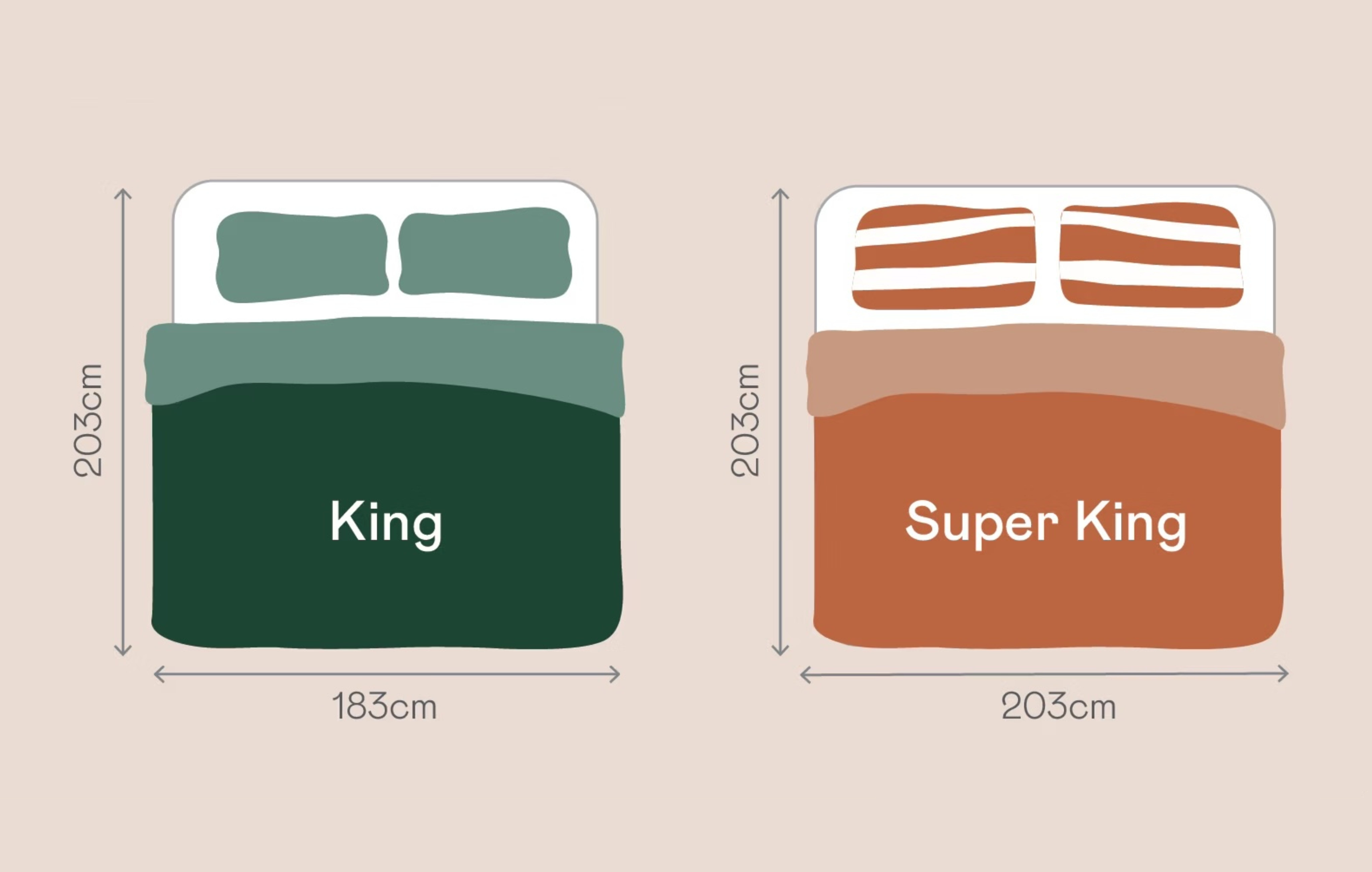 Both beds have the same length, but a super king bed is 20cm wider. Essentially, this means that each person gets an extra 10cm of sleeping space. It might not sound like much. But it's the difference between brushing shoulders when you roll over and having enough room to move without touching at all.