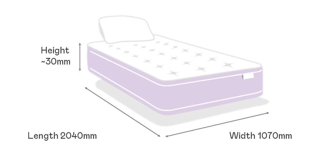 The size of a standard king single mattress is the second-narrowest option, being 150mm (15cm) wider and longer than a single mattress. The dimensions of an Australian king single mattress is normally 1070mm x 2040mm (107cm x 204cm).