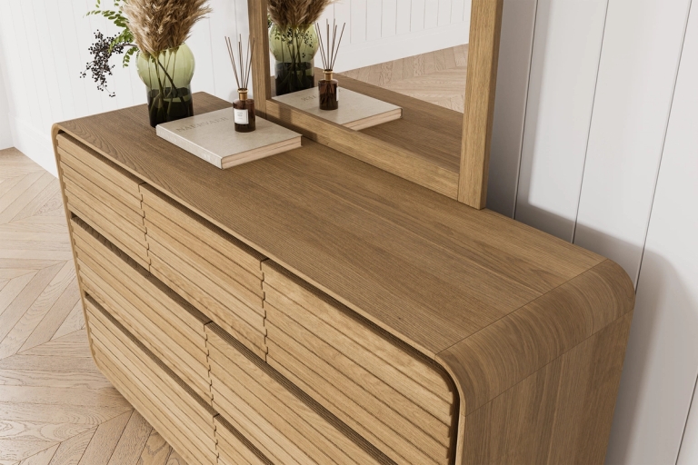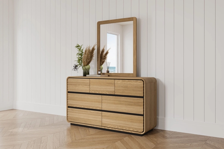 Get your ZZZ’s in style with the Brooklyn Dresser with Mirror. Featuring smooth curves and a sleek, modern design, this piece brings sophistication and practicality into your bedroom. With spacious drawers and a matching mirror, it’s the perfect blend of function and flair. Start and end your day with ease — style has never looked so good!