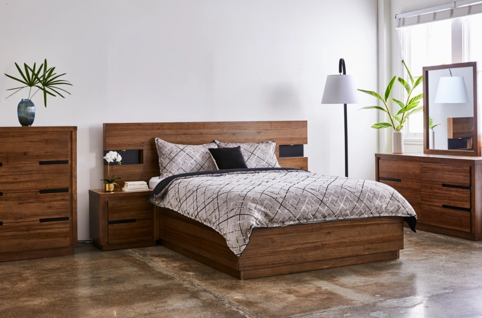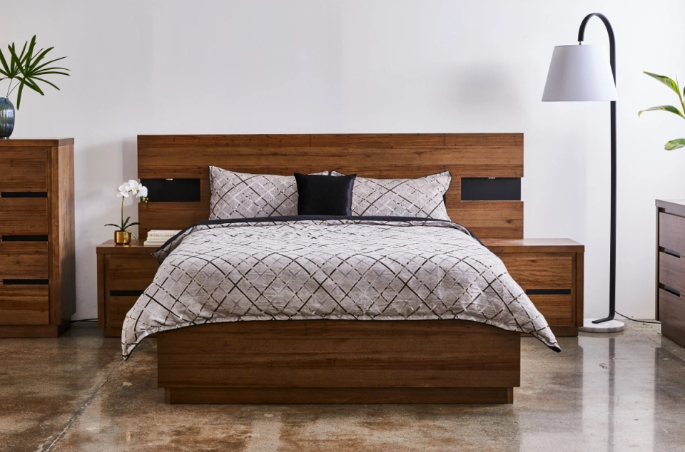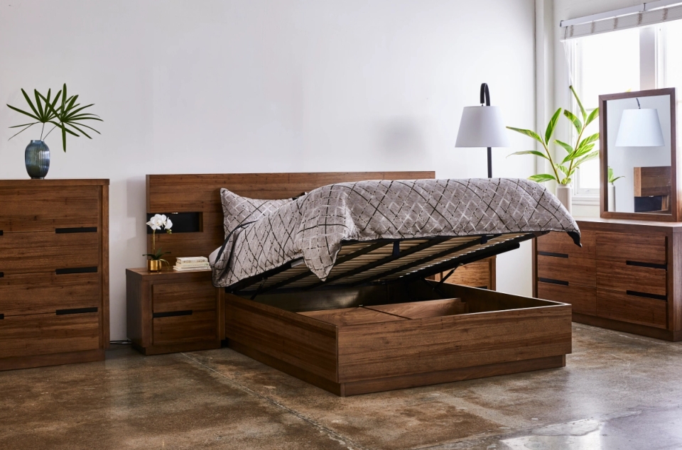 The Brunswick Range incorporates style, storage, and innovation. Crafted from a combination of solid Mountain Ash timber and veneers, the Brunswick bed frame is sophisticated and on trend. The extended bedhead will create a focal point for your bedroom. Features include: Touch activated LED lighting with 3 levels of brightness / Gas-lift underbed storage.