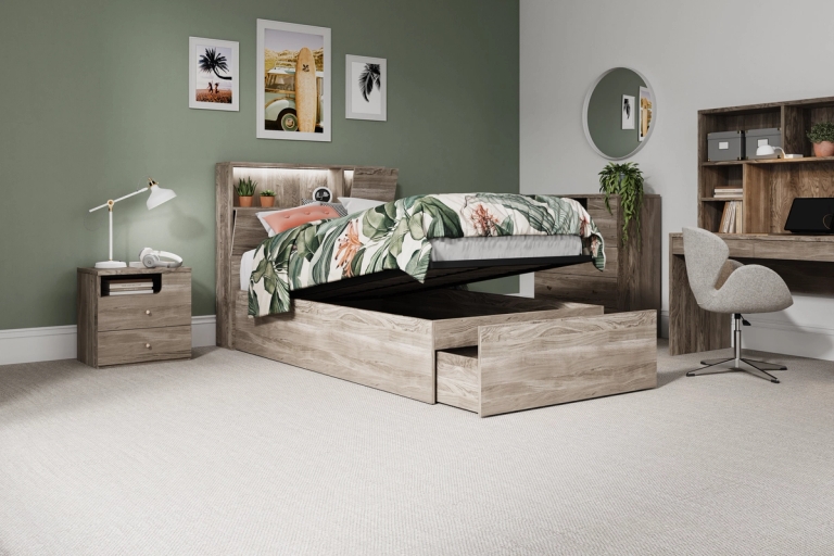 Buddy Bed Frame with Drawer and Gaslift Storage - Oak