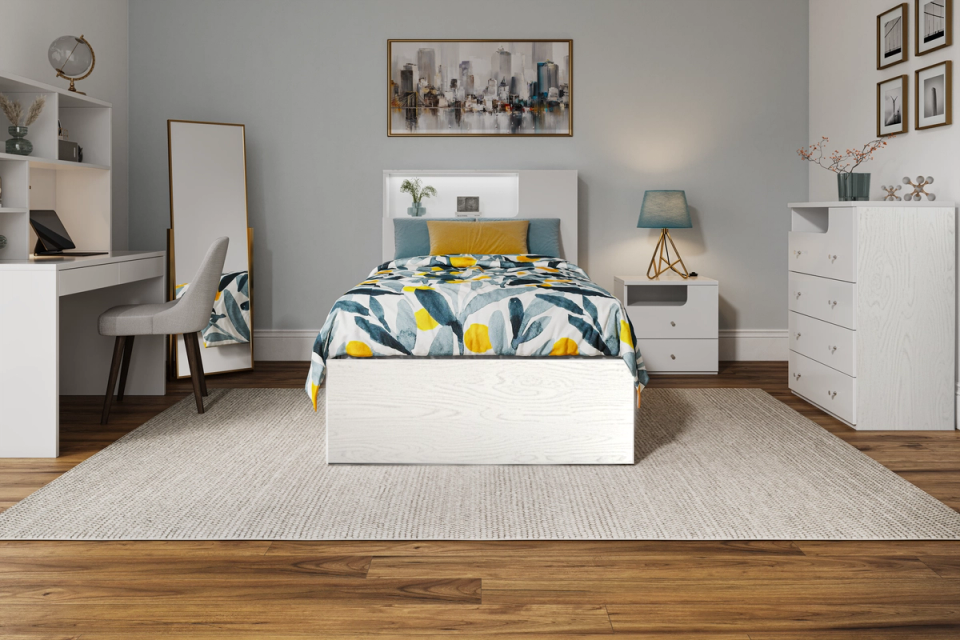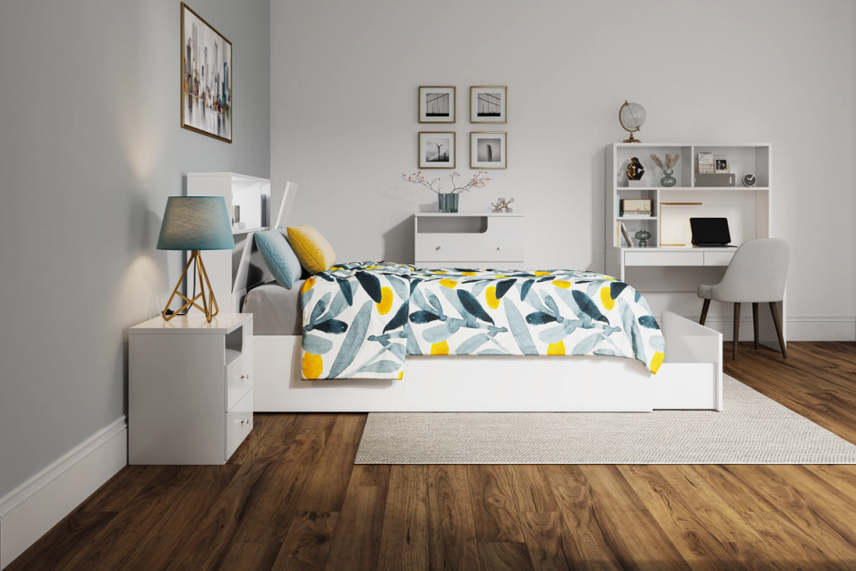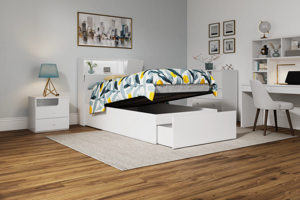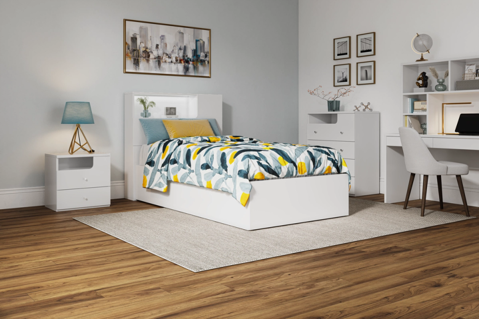 The Buddy range does not let functionality get in the way of eye-catching design. The Buddy bed frame has all the mod cons which will have your child counting down to bedtime. With its matte white wood grain finish, this bed brings a clean, modern feel to your bedroom. Features include: Concealed bed head storage / LED lighting / Wireless charging pad / Under bed gas-lift and drawer storage.