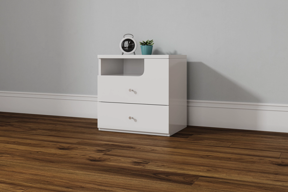 The Buddy range does not let functionality get in the way of eye-catching design. The Buddy bedside table will be a welcome addition to your home. A matte white wood grain finish makes the perfect foundation for your new bedroom.