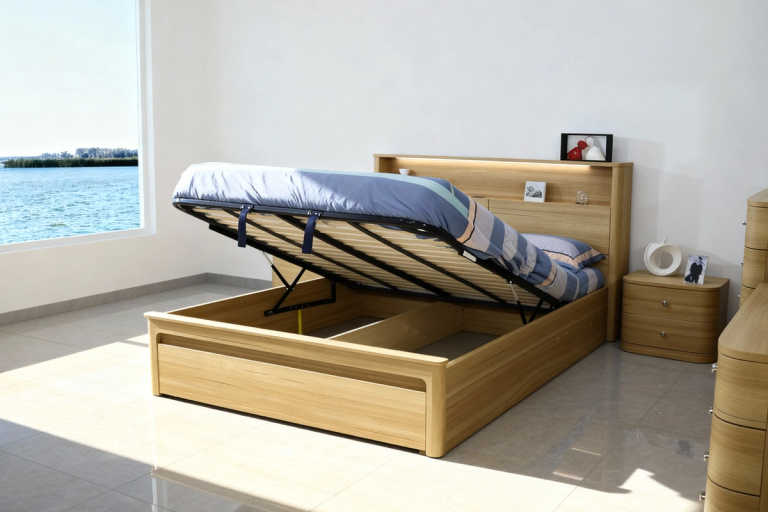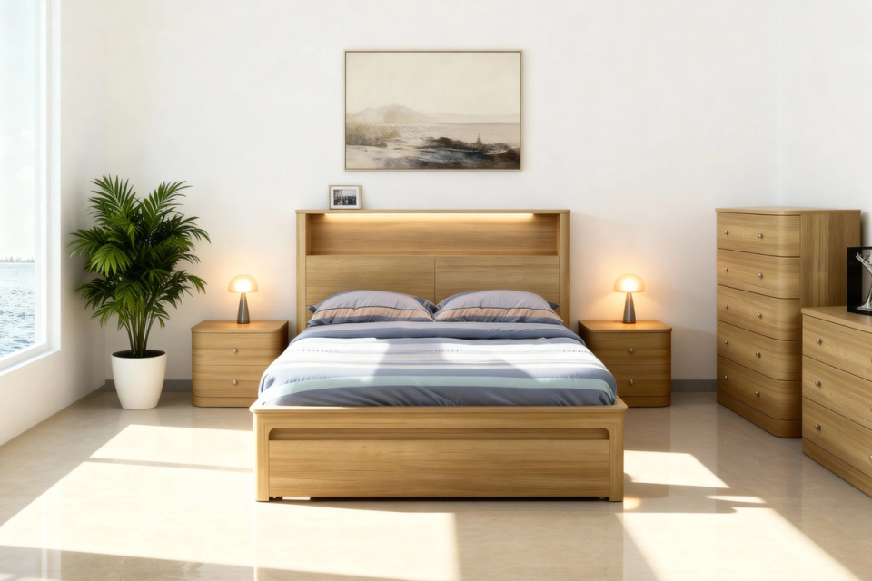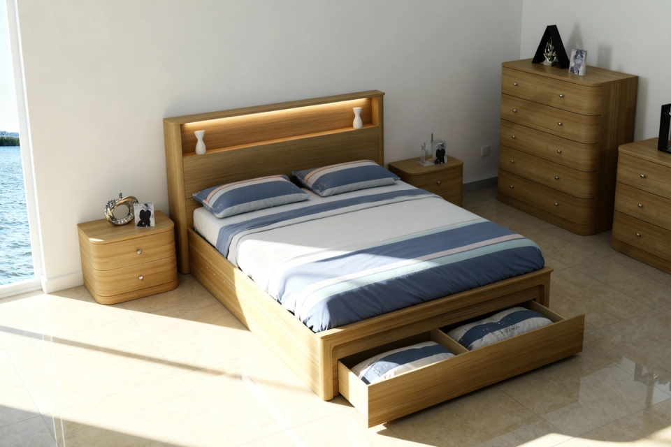 Our Capri Gaslift Bed combines elegant curves with smart functionality, creating the perfect balance of design and convenience. With integrated storage options and a warm ambient glow, the Capri transforms your bedroom into a stylish and practical sanctuary. The Capri Bed features: LED headboard lighting to set a calm, relaxing mood. Gaslift storage system offering generous hidden space beneath the bed. Front pull-out drawer for added easy-access storage. Built-in headboard compartments to keep your essentials within reach. Contemporary timber finish that complements both classic and modern interiors. A statement piece that blends craftsmanship, innovation, and everyday comfort — the Capri Bed is where modern living meets effortless style.