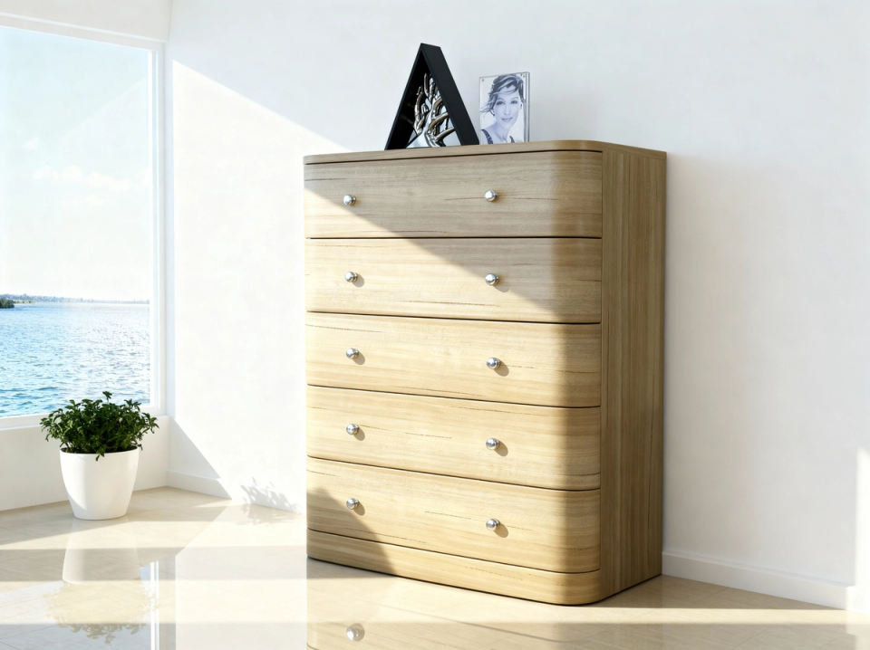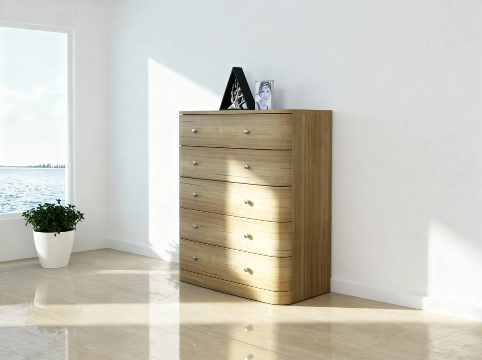 The Capri Tallboy brings a touch of sophistication to your bedroom with its beautifully curved edges and smooth contemporary design. Thoughtfully crafted to combine style and practicality, it offers generous storage across five spacious drawers, perfect for keeping your space neat and organised. The warm timber finish ties seamlessly into the Capri suite, delivering timeless appeal and modern elegance in one refined piece.
