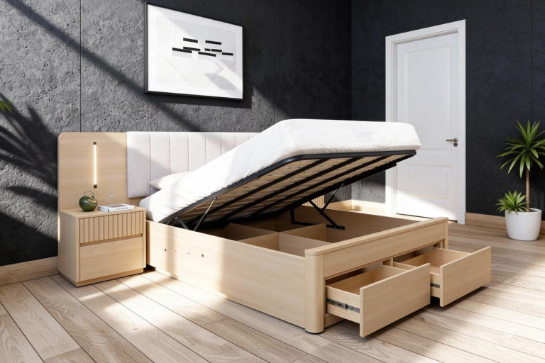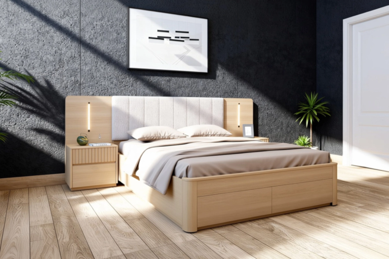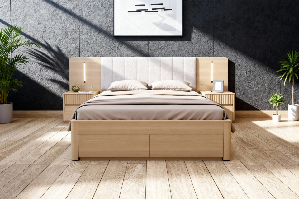 Our Grenada Bed, now available in two colours, Blonde Oak and Walnut, combines warm timber tones with soft upholstered detailing for a refined, contemporary look. Timber bedhead wings frame the vertically panelled fabric insert, creating a balanced focal point in the bedroom. The Grenada Bed features:• Integrated bedhead lighting• Built-in USB-C and USB charging ports• Gas-lift storage with front drawers for added practicality