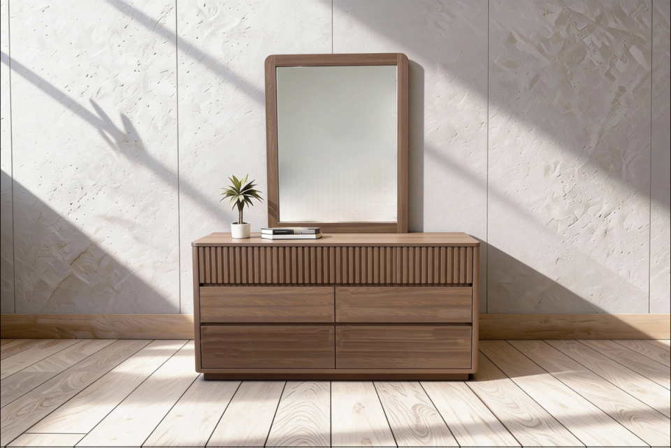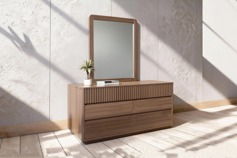Our Grenada Dresser with Mirror, now available in two colours, brings modern elegance to the bedroom. Subtle vertical detailing adds a refined edge to the design. With spacious drawers and a matching mirror, this piece will become a stylish focal point in your space.
