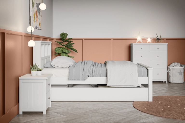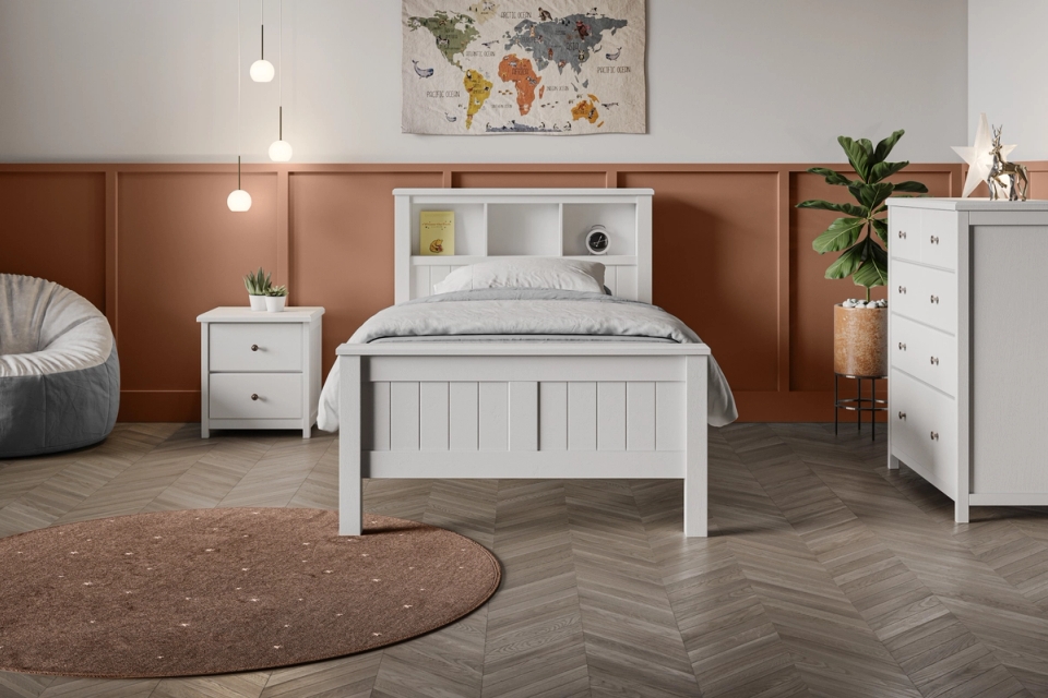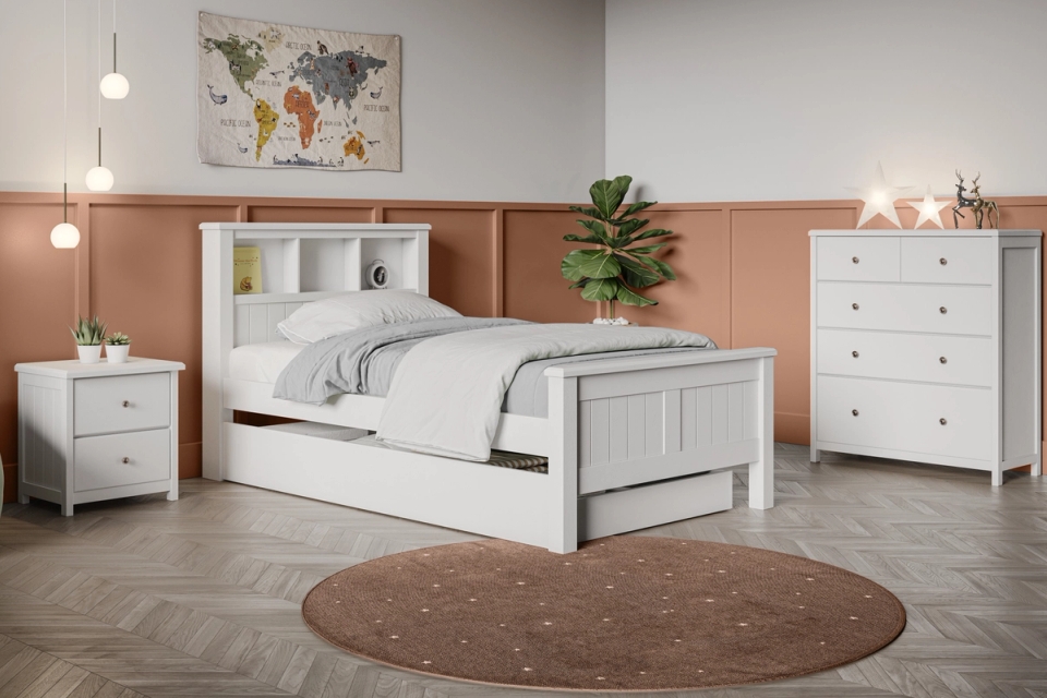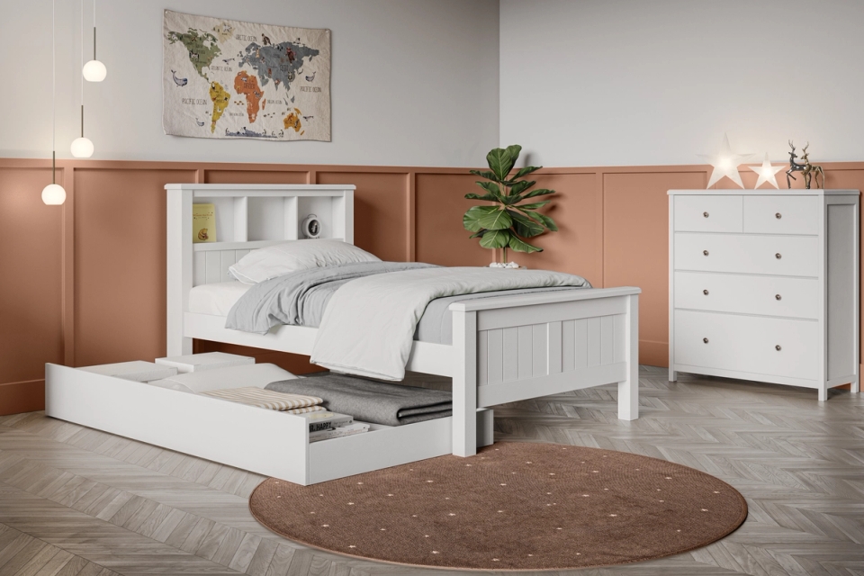 The Logan bedroom range has an effortless design, with a bookend bedhead the Logan bed frame range has been created to grow with your child. From the first bed out of their cot through to your teen, the Logan Bed is built to last. Features include: bed head storage shelves / underbed Trundle (sold separately)