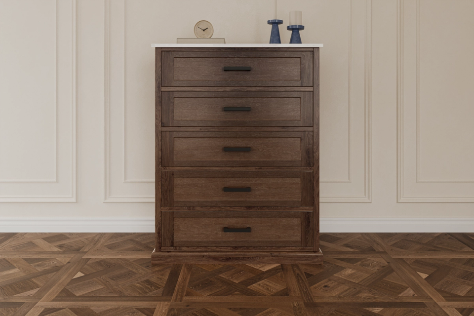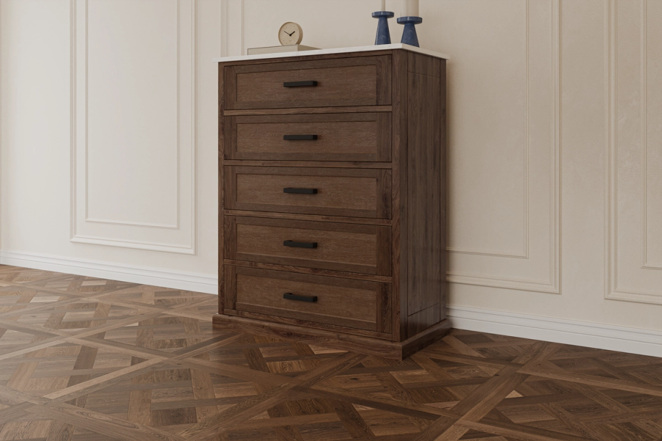 The Mozart Range displays a rich, dark timber timber fame with classic white accents. The accompanying tallboy also features a white, marble-like solid stone top to create a classical elegance for any master bedroom.