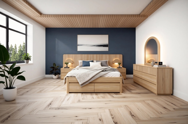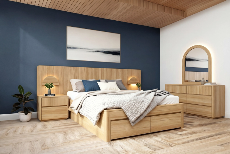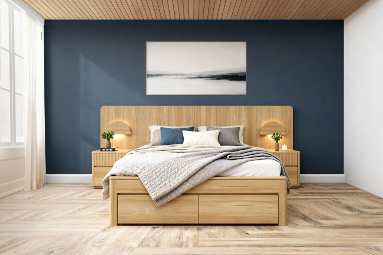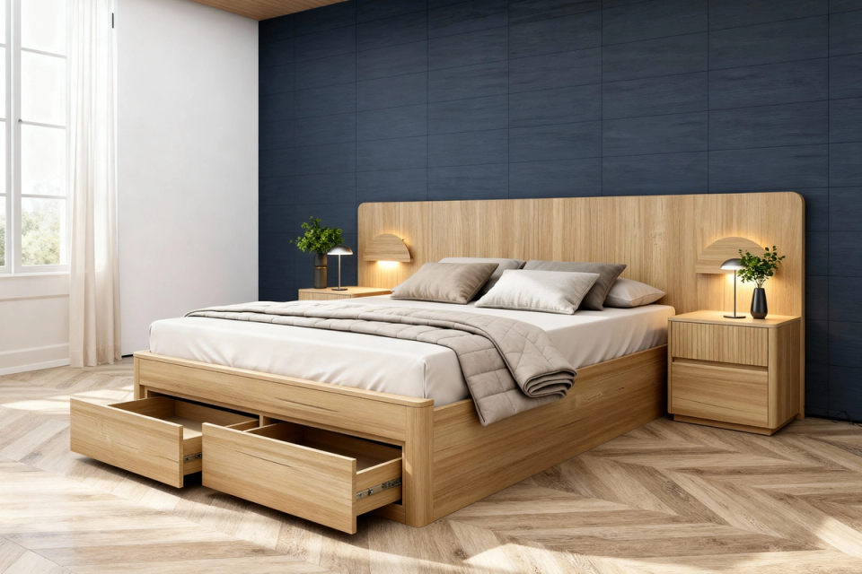 Our Norfolk Bed brings warm timber tones and clean, contemporary lines to your bedroom. The beautifully crafted bedhead features integrated LED lighting with discreet USB and USC charging ports conveniently positioned behind it. With a gas-lift storage base and practical front drawers, the Norfolk Bed is designed to be both functional and a standout feature in your space. The Norfolk Bed features gas-lift storage, front drawers, integrated LED bedhead lighting, and built-in USB and USC charging ports.