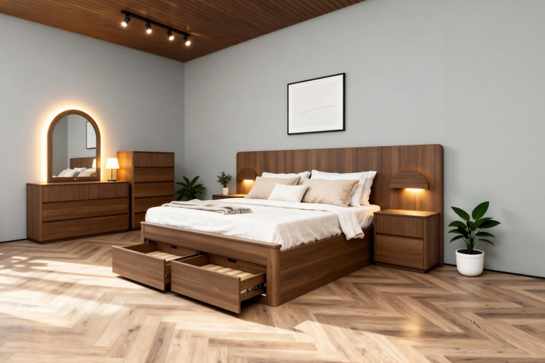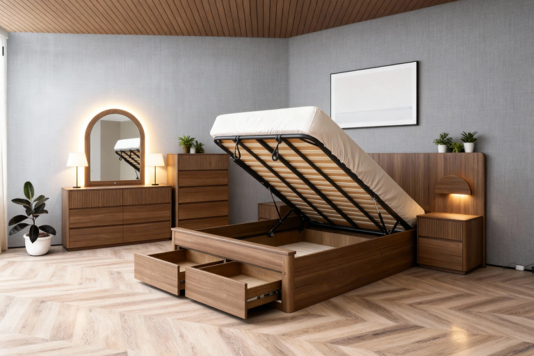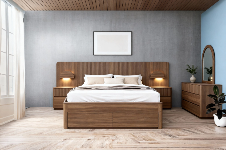 Our Norfolk Bed brings warm timber tones and clean, contemporary lines to your bedroom. The beautifully crafted bedhead features integrated LED lighting with discreet USB and USC charging ports conveniently positioned behind it. With a gas-lift storage base and practical front drawers, the Norfolk Bed is designed to be both functional and a standout feature in your space. The Norfolk Bed features gas-lift storage, front drawers, integrated LED bedhead lighting, and built-in USB and USC charging ports.
