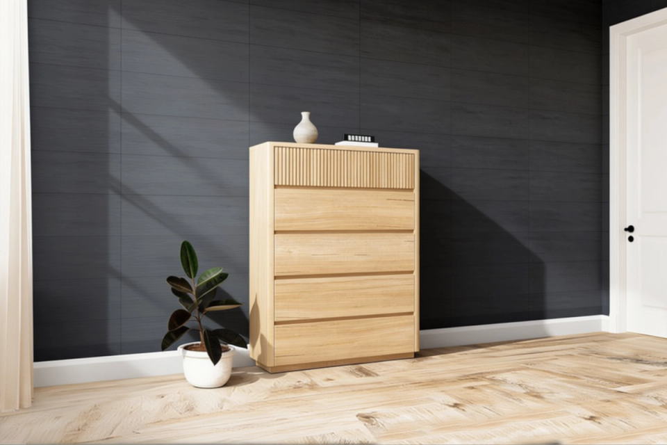 Our Norfolk Tallboy, now available in two colours, features soft curves and refined timber detailing that bring warmth and texture to your space. Vertical panel accents add a modern edge, while the tall, streamlined design offers generous storage, making it a stylish focal point in your bedroom.