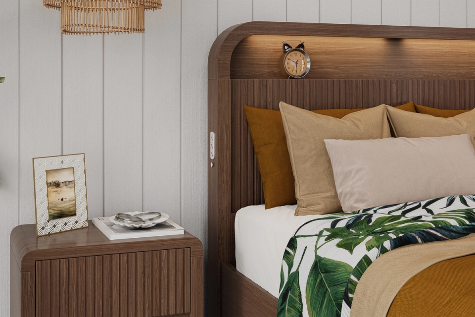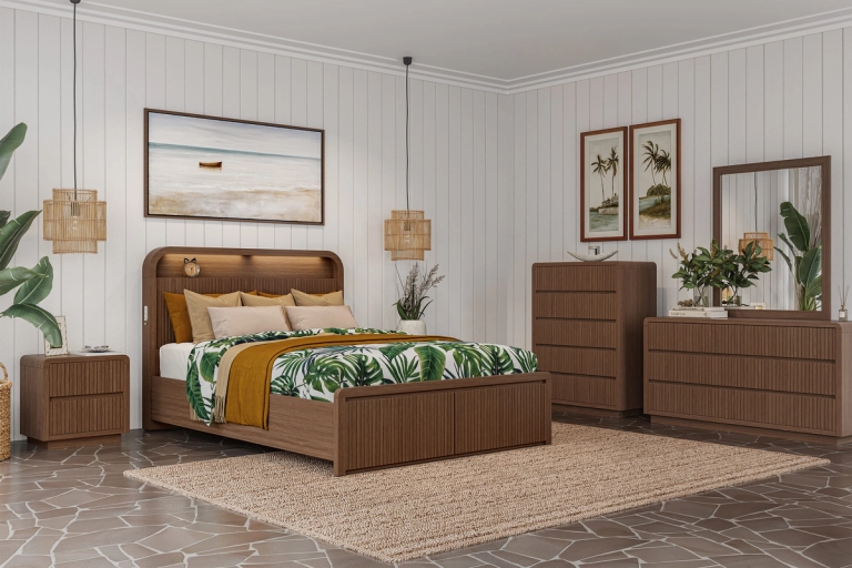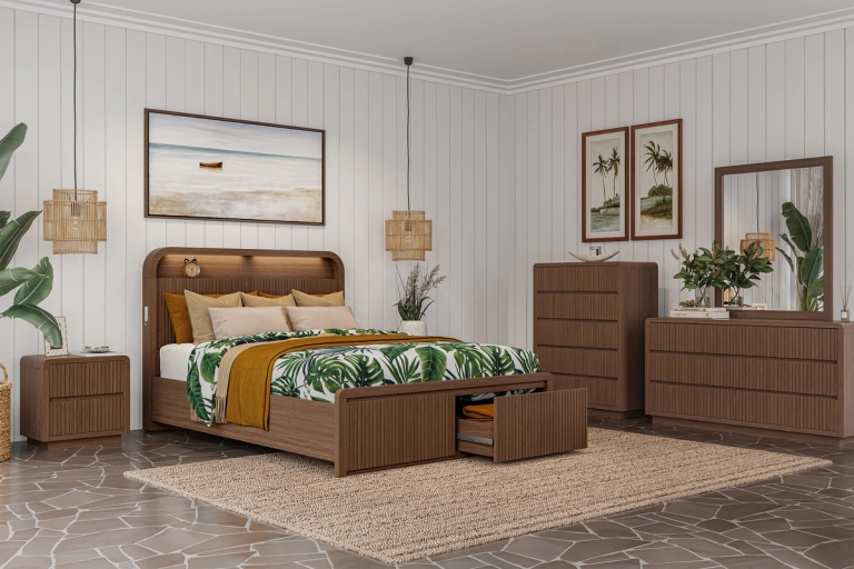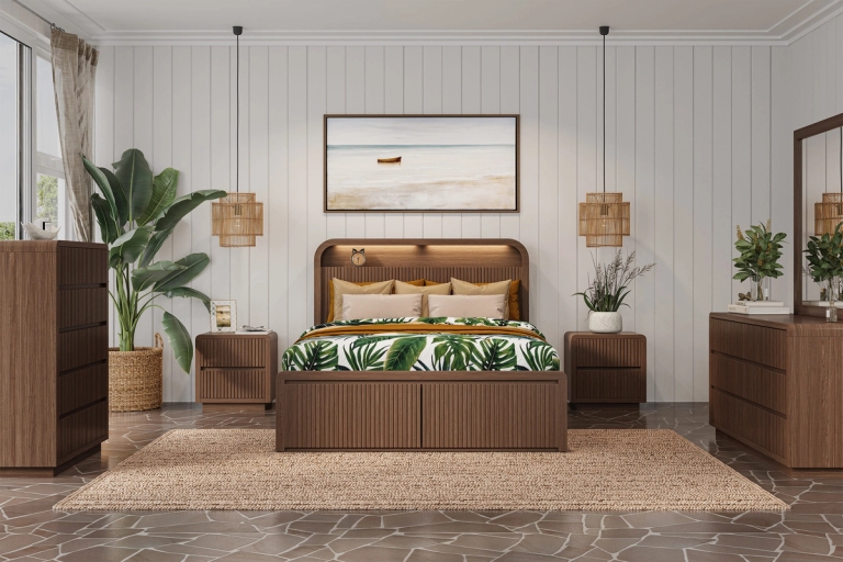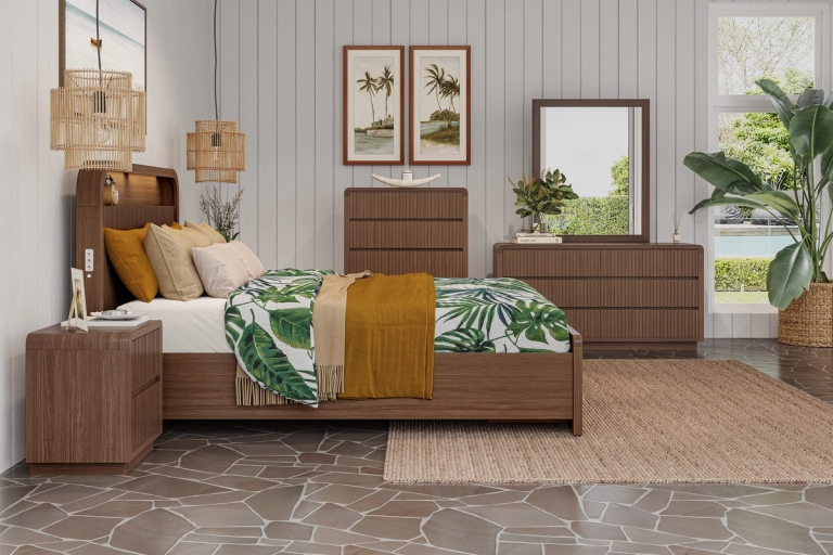 Our Oslo Bed, now available in two colours will be a contemporary addition to your home. Timber cladding adds a modern edge to the bed. With shelf storage in the bedhead, this bedroom suite will become a focal point in your bedroom. The Oslo Bed features: Dimmable bedhead lighting and USB and USC charging ports