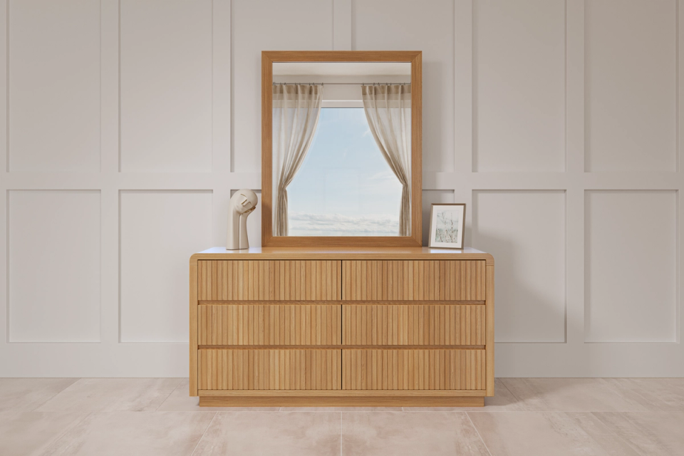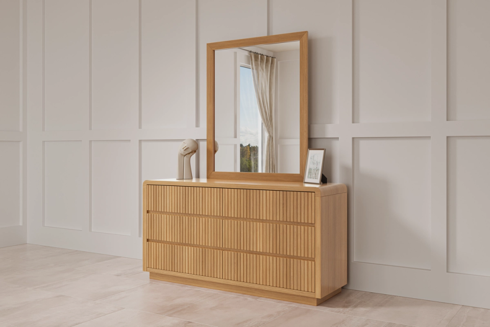 Our Oslo Dresser with Mirror, now available in two colours, has curves in all the right places. Vertical panel detailing adds a modern edge to the design. With spacious drawers and a matching mirror, this bedroom suite will become a focal point in your bedroom.