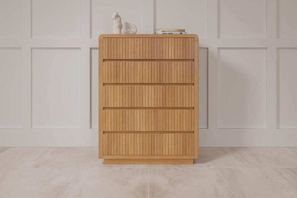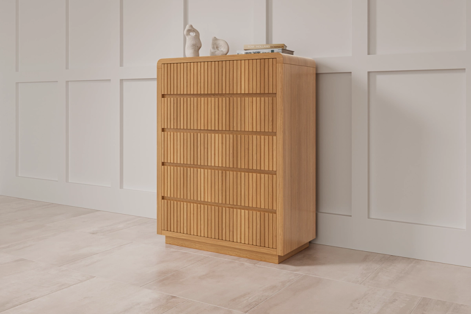 Our Oslo Tallboy, now available in two colours has curves in all the right places. Timber cladding adds a modern edge to the bed. This bedroom suite will become a focal point in your bedroom.