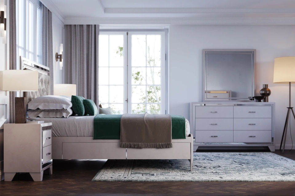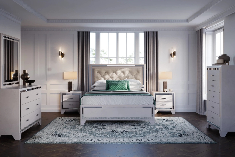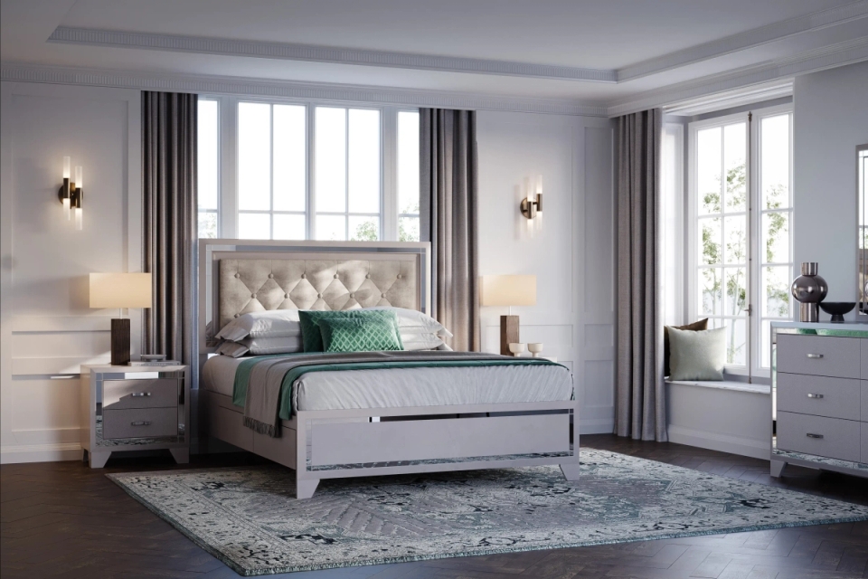 Palatial by both name and nature. Our palatial bedroom range will add extravagance and opulence to your master bedroom. With sumptuous upholstering and a contrasting silver and champagne colour finish, the Palatial Bedroom range will be a welcome addition to your home. Features include: Upholstered bed head inlay / LED lighting surrounding the bed head / mirror trims around bed frame / under bed drawer storage