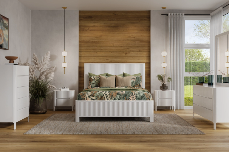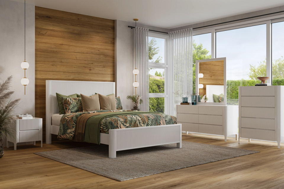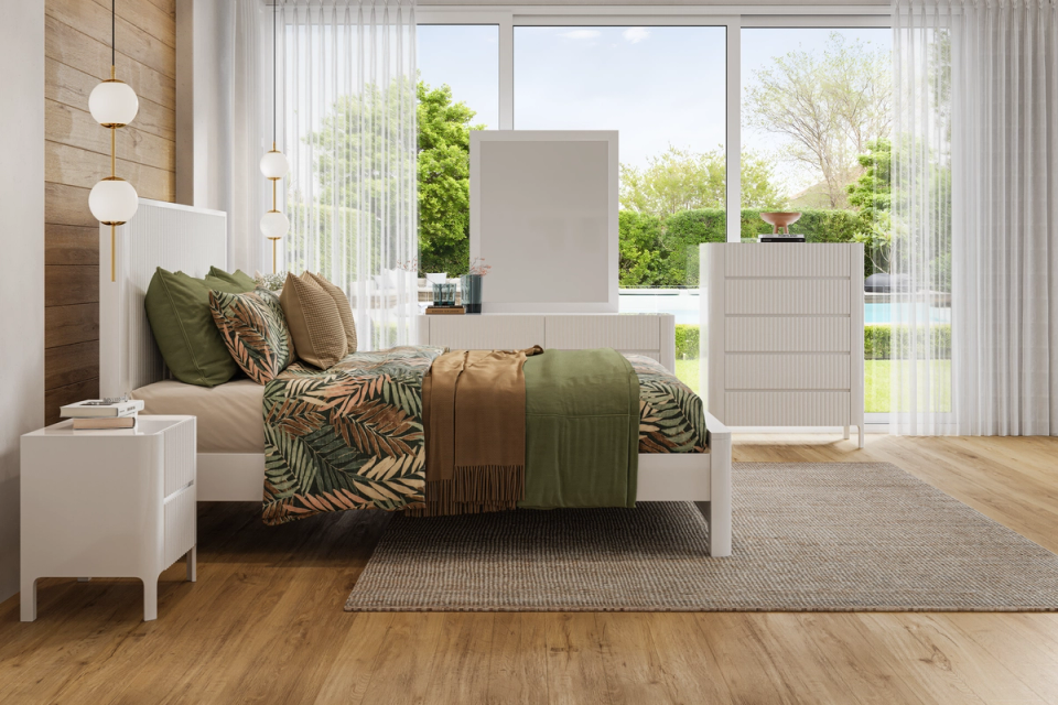 Transform your bedroom into a chic oasis with our Portugal Bed Frame. Its modern white finish adds a contemporary touch while becoming the focal point of the room. Upgrade your space with style and comfort. Features include: all furniture items include a white, marble-like stone inlay top.