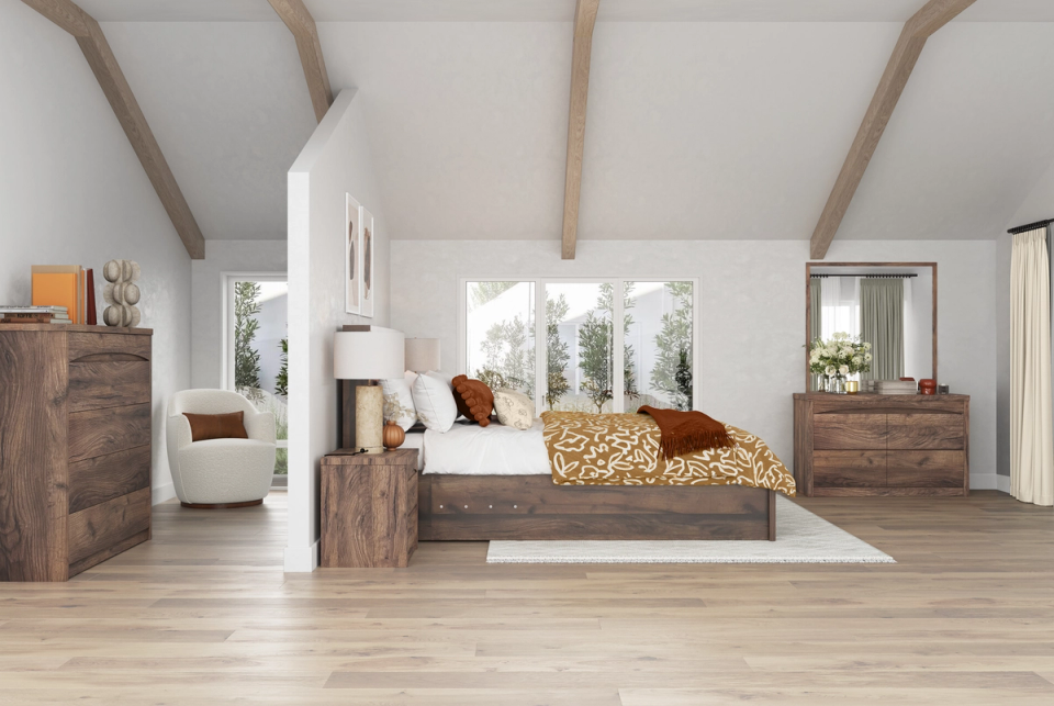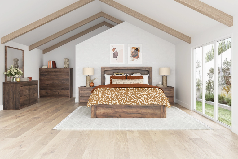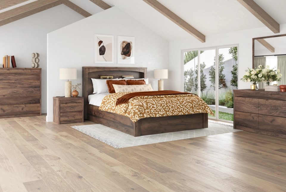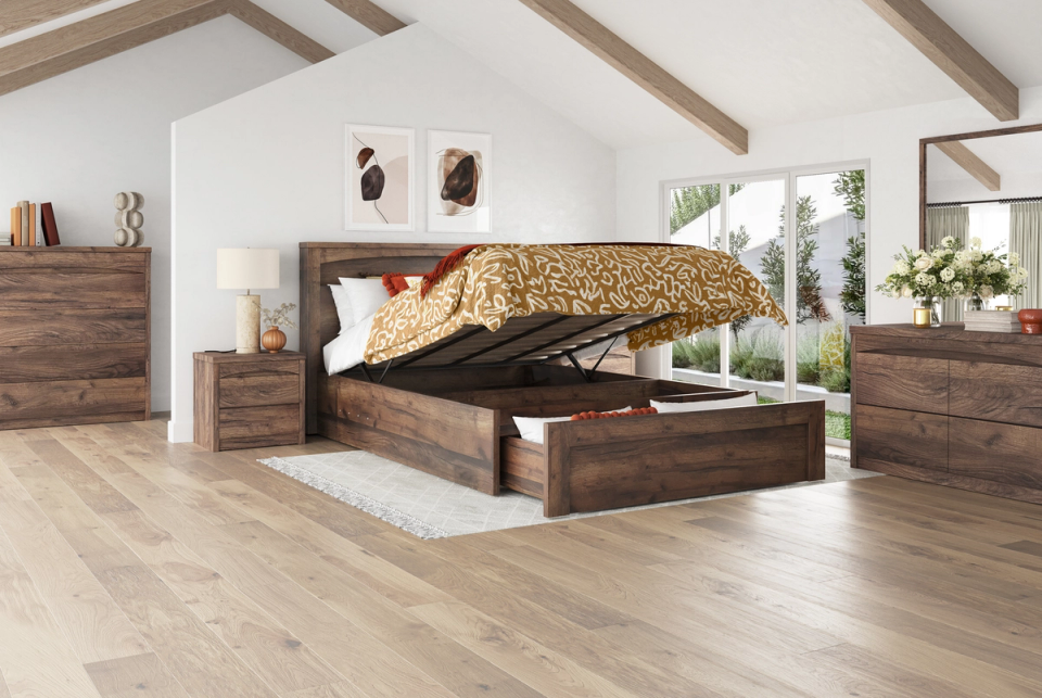 Introducing the Rome Bed Frame - the ultimate combination of style and function. With bedhead gas-lift storage, this bed offers maximum organization for your space. Don't just sleep in it - live in it! Features include: Bed head storage / LED lighting / Wireless charging pad in bed head / Underbed gas-lift storage. Each furniture piece features a shallow-height top drawer, convenient for storing small items such as jewellery. Optional White or Walnut timber colours available.