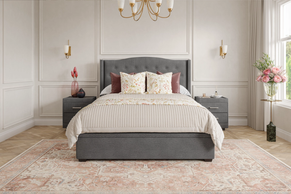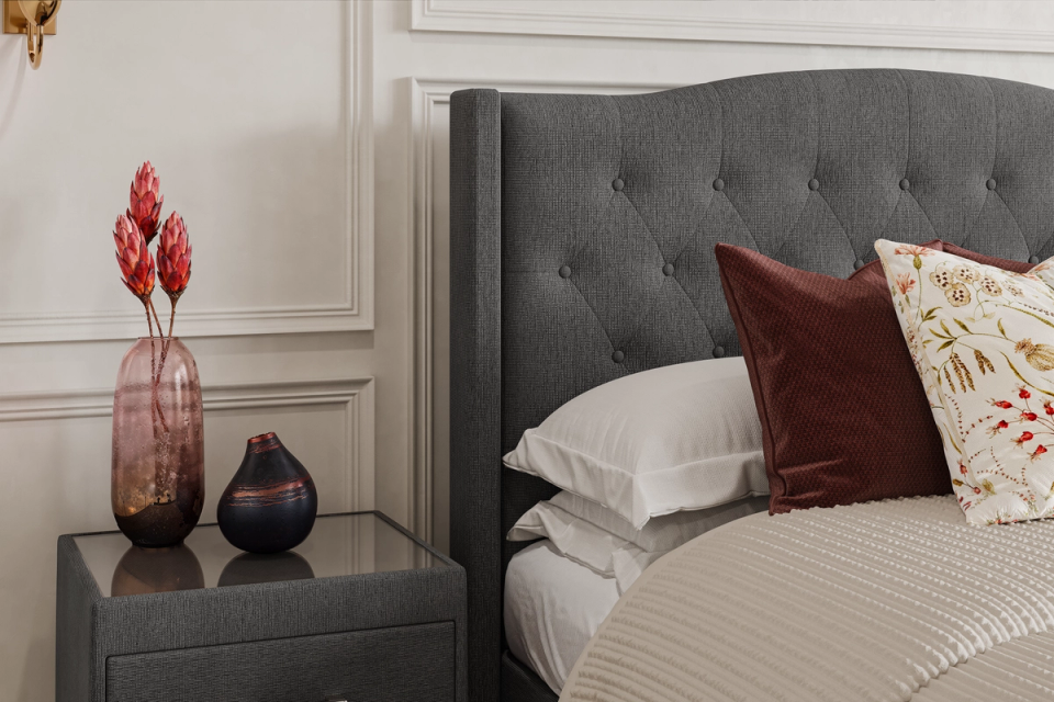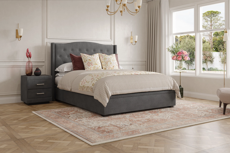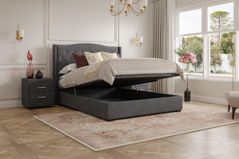 The St Moritz Bed combines refined elegance with everyday practicality. Upholstered in a soft Grey fabric, its sculpted, button-tufted headboard and clean, tailored frame create a timeless silhouette. Designed with a gas-lift mechanism for effortless underbed storage, the St Moritz is a smart solution for modern living and a sophisticated focal point for any bedroom. Optional Natural or Grey fabric colours available.