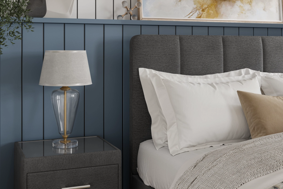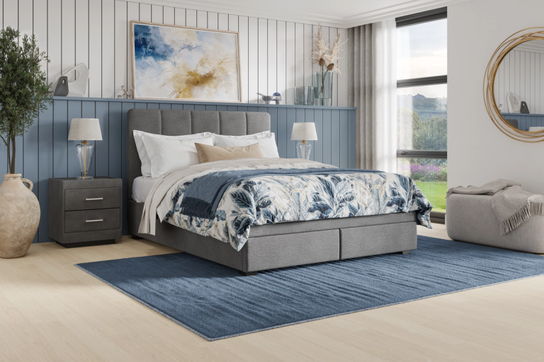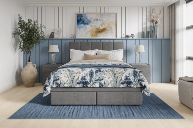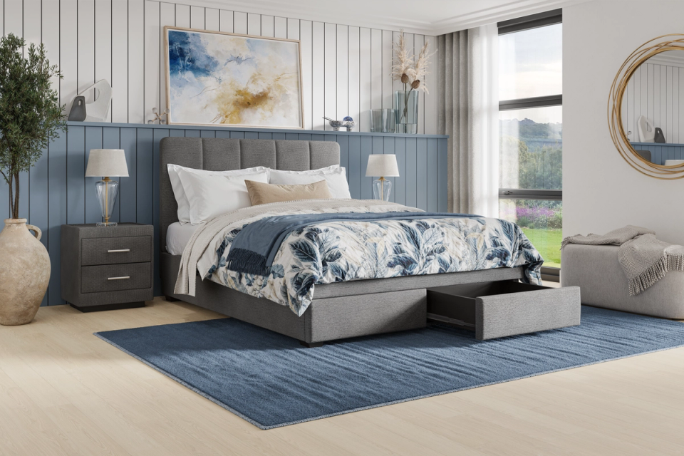 The Tuscan Bed blends modern charm with functional design, upholstered in a soft Grey fabric that suits any decor. With its clean lines, padded headboard, and two spacious front drawers, this bed is a stylish storage solution and a calming bedroom centrepiece. Optional Natural or Grey fabric colours available.